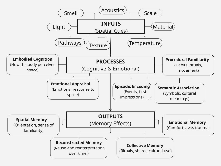 Unlike traditional architectural theory, which often treats memory as symbolic or metaphorical, this study offers a model grounded in affective neuroscience, spatial cognition, and culturally embedded spatial practices. It invites future researchers and practitioners to approach architecture as a multisensory memory interface, where form, behaviour, and meaning are inseparably linked.