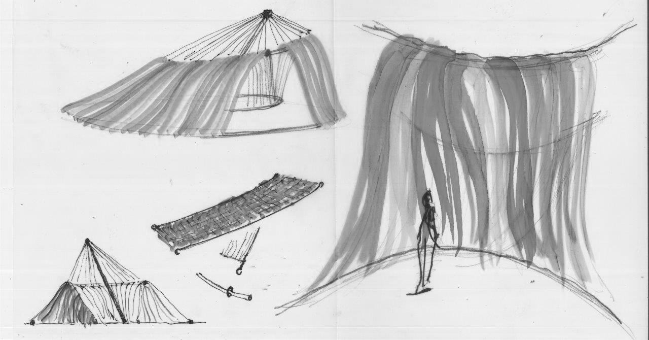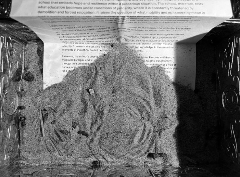 In my competition entry, the school is envisioned as a field of bodies, objects, and energies (as sketched in Figure 1), centered around a malleable circus tent — not only to weave children’s hopes for a liberated future, but also to bridge stories and memories across generations, geographies, and cultures. Proposing the school as a circus for children carries another meaning as well: it relates to the movement of evicted children to other places, and equally the transportation of objects and fragments from the site with them. As part of my competition entry board, a key aspect of my proposal, as I stated, is the perception of the school as a ‘collective’: “the school’s body is, in fact, the collective body of children. It moves with them, is mobilized by them, and, in turn, mobilizes their bodies and shapes their dreams.” As depicted in Figures 1 and 2, this reciprocal relationship is materialized through the imagining of the school as “a fragment of Khan al-Ahmar ground, holding and fostering the community’s social relations. The school inhabits the land, gathering people, stories, and memories. Traveling with the children as they carry a fragment of the ground with them.” And, as such, social relations and attachment to the land are maintained and fostered by the very materiality of the fabric tent, despite its fragility and ephemerality.