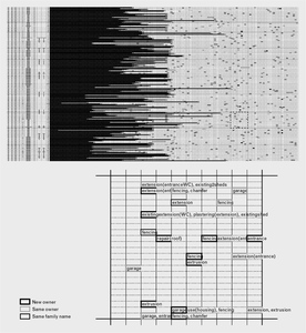 This was carried out by shortening the notes to single words—for example types of changes were coded as extension, extrusion, roof etc—, entering them manually into Excel, and organising them into a tabular form (Figure 7). Each row corresponded to one house address, the first columns contained information from the spatial dataset, such as the code of the statistical block or the ID of the building geometry, while the following columns covered each year from 1853 to 2000. Strings (character-based data) were inserted into the cells, describing all the changes taking place in a particular address on a specific date. Border styles were used to indicate the status of ownership, while drop shadows were added to indicate the condition of the building or financial transaction. The table was then imported to RStudio. The text and styles were converted to a canonical dataframe, which had one row for every single type of change. The new ‘molten’ datatframe was further widened by attaching to it the rest of the gathered information, like the construction cost or the owner’s profession. The final dataset was mostly consisted of nominal data, namely qualitative labels which could not be ordered or measured, but could be statistically analysed in terms of clustering, frequency, counts, or percentages. Eventually, the table was joined to the vector-based spatial dataset based on the matching fields—the ID of the various building and plot geometries—and statistically analysed in R.